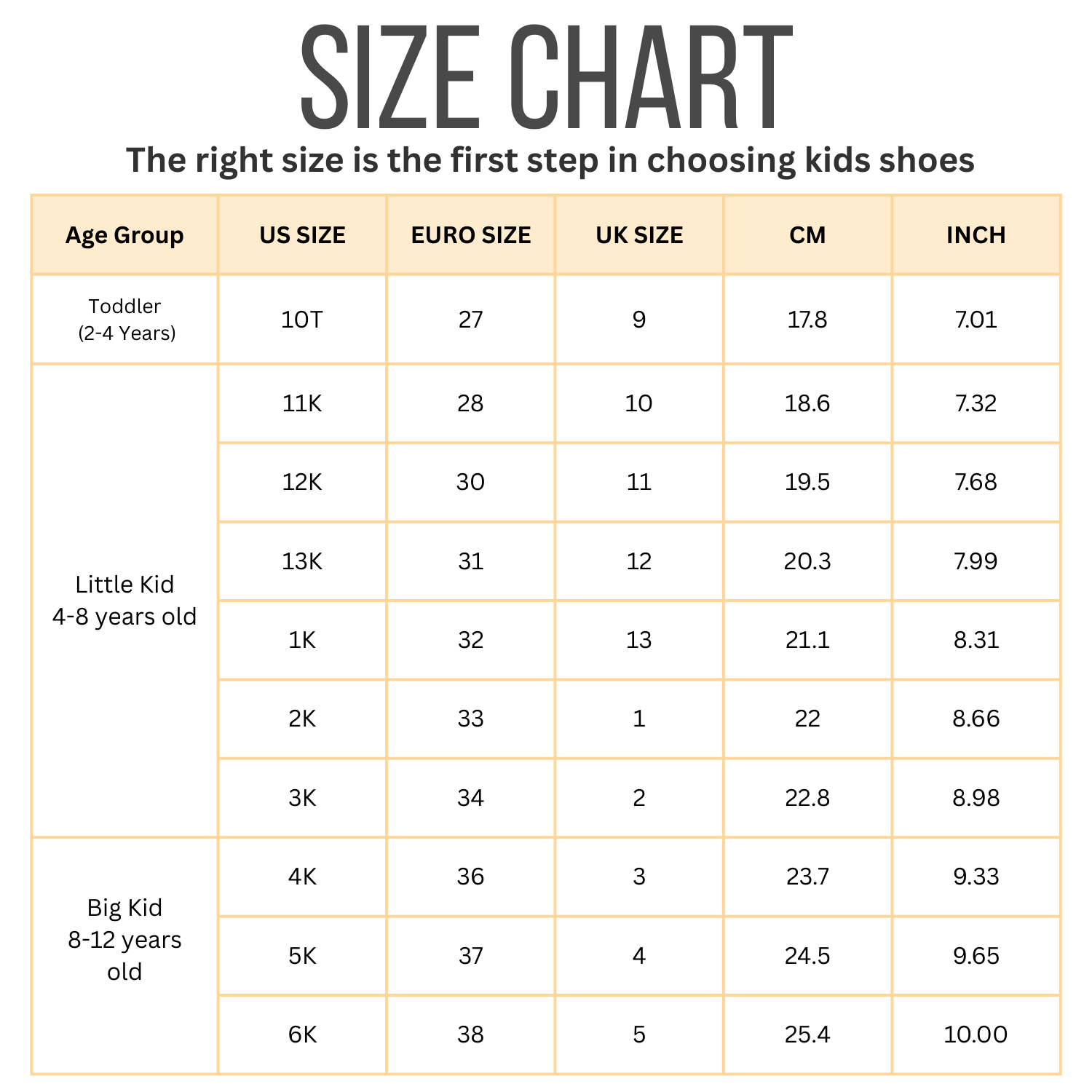 | US SIZE | EURO SIZE | UK SIZE | AGE GROUP |